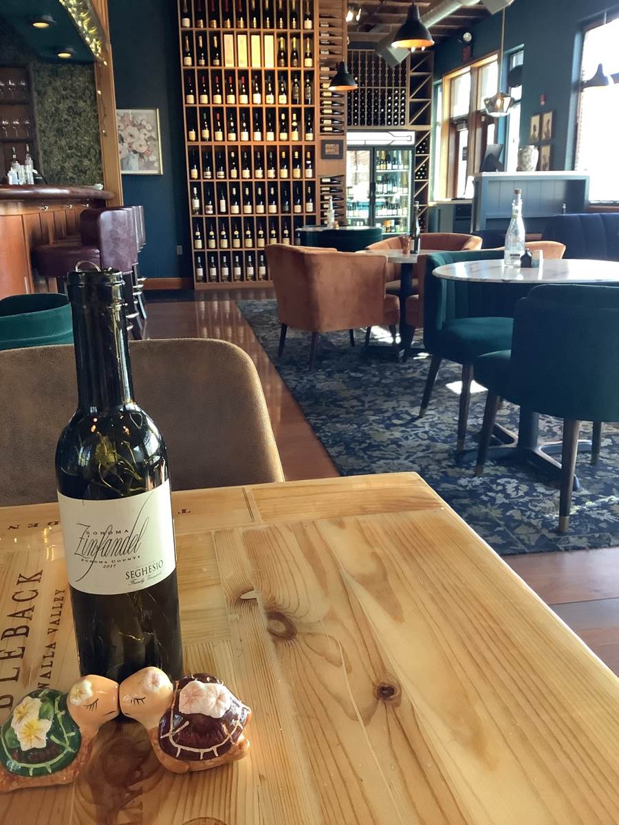 • Wine bottle being featured in the dining room at Bistro Colette restaurant.