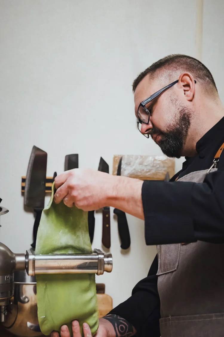 • Chef preparing fresh pasta dish.