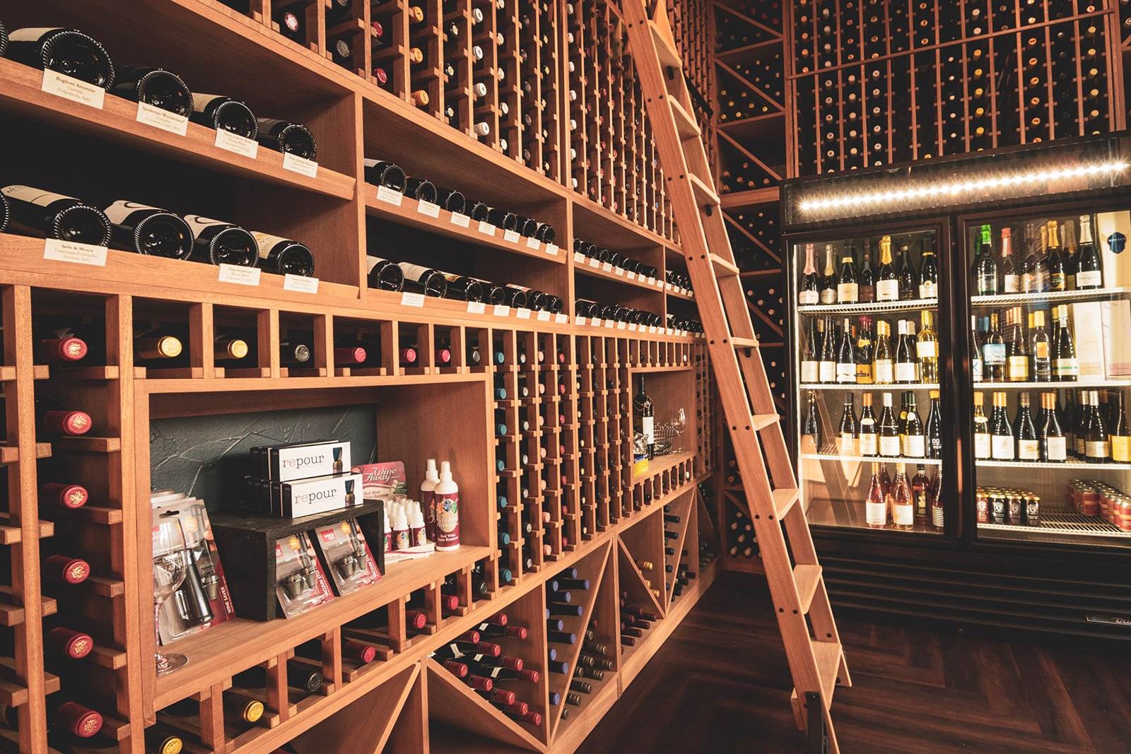• Flights Wine Bar interior featuring a large inventory of wines.